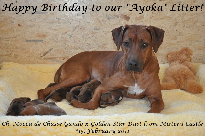 13. February 2012 Today our Ayoka Litter celebrate their first birthday. They grown up to selfconfident, healthy and pretty young dogs. All families love and cant live without this dog. Thank you all, that you all love your little dog! Happy Birthday to all our cute Ayokas! Thank you Eddi & especially Luna fot his wunderfull litter!