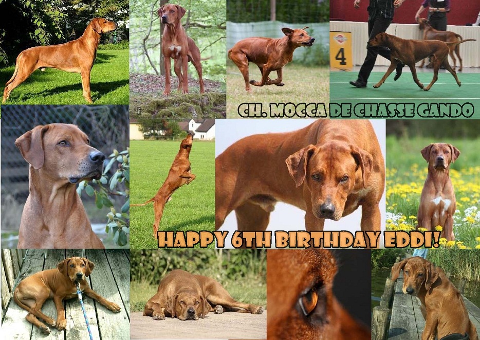 20. April 2012 Unbelievable but true, our Eddiboy is now 6 years old. Eddie was supposed to "only" be a family dog. And where are we now? The small "bear" is champion and proud father of 21 puppies- 20 puppies are correct and grown up to very nice dogs and they are living in germany, czech republik, slowakia and poland. Eddie is such a wonderful guy who enriches our lives every day. He is so wonderful selfconfident, lovely, pretty and really great with his "wife" and daughter. Slowly he turns gray, but still just as funny as ever! Stay with us for a long time get-Happy Birthday Eddi!