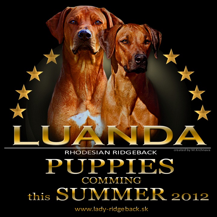 After Eddis kids from Luanda Kennel are arrived in France, Latvia, Slovakia and Germany, the next 2 puppies are at home in wonderfull sweden! Now just these pretty, showquality and cute girl is looking for the perfect home. If you are interested in this handsome girl, you can contact us or have a look on www.lady-ridgeback.sk. Escape to Heart by Luanda Ch. Mocca de Chasse Gando "Eddi" x Multi- & Grand Ch. Alexis Femme Fatale Luanda |