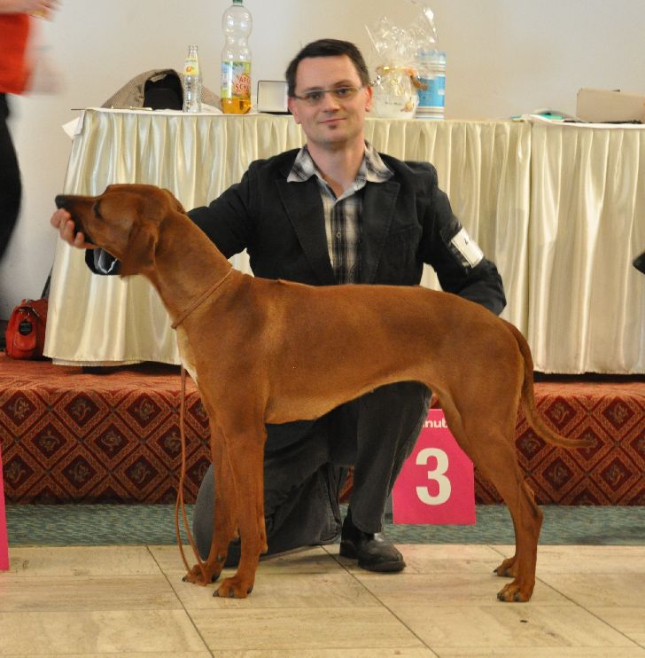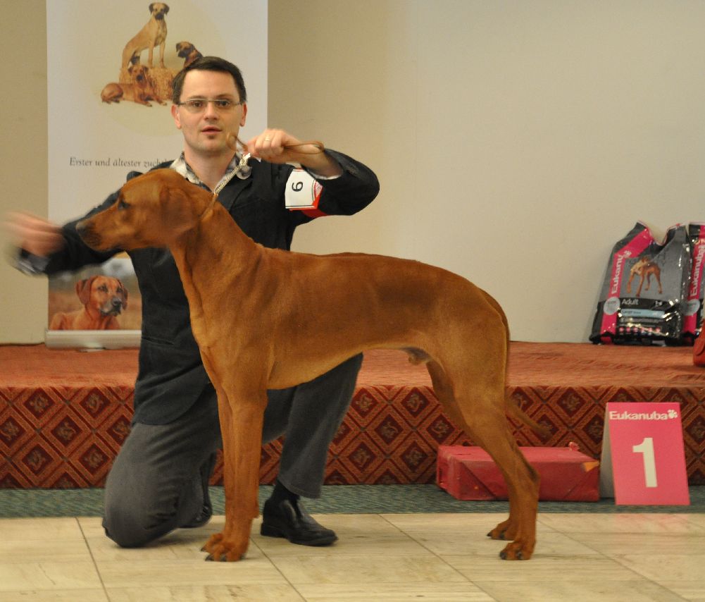 21. October 2012 Eddis son "Corado Manwe", called Safi, had his showdebut in Posen. Judge was Mr. Tomasz Mrozek (PL) and he gave him a very nice report: "very promissing body, friendly character, nice head, correct scissorsbite, good neck, correct angulations, correct ridge, deep chest, correct movement, very well presentation" - Very promissing 1st place! We are very proud of him and his owner! |