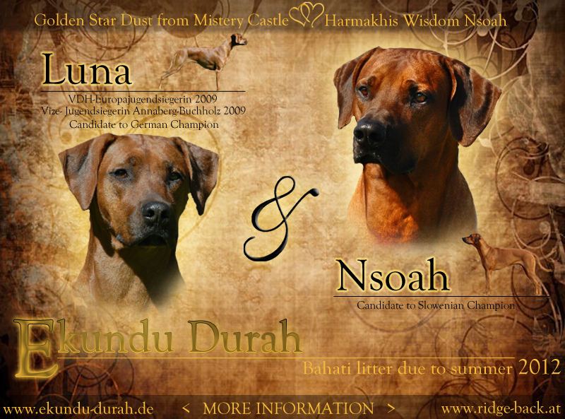 | Nsoah ist a tall, selfconfident, muscle bound and very expressive rhodesian ridgeback, having extraordinary strong bones, a firm straight back line, shear in his movement, a very handsome head and strong red wheaten colour. He is a dog with an open and friendly charakter, possesing a very good sense of smell. Being a good climber and nimble footed jumper, he seems to never get enough action... Nsoah is curious, territorial and very vigliant. He is a working dog, always willing to work with his guide f.ex. obediance, mantrailing, coursing, service dog and he is a very fast student. |