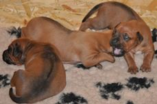 Ein paar Worte zwischendurch - Tag 38 Unsere Bahatis machen uns sprachlos. Sie sind so klasse. Wenn einer nach einer Weile wieder kommt, sei es von der Arbeit oder vom Einkaufen (einer ist natürlich immer zu Hause) kommen die Kleinen freudig auf einen zu und machen die typischen "Schlangen-Ridgeback-Bewegungen", weil sie sich so freuen. Wenn man ruft oder pfeift kommen sie voller Freude auf einen zu gerannt- echt toll! Als "Belohnung" gab es heute die 3. Einheit (3 Tage lang) Wurmkur. Das hat denen geschmeckt... Luna zieht sich immer mehr zurück, wird ja auch langsam Zeit. Wenn man fast 5 kg auf die Wage bringt, sollte man schon zum Großteil feste Nahrung zu sich nehmen. Faraa blüht derzeit regelrecht auf, sie liebt es ganz vorsichtig mit ihren Halbschwestern zu spielen. Heute waren die drei Kleinen mal alleine im Garten, ganz ohne Mama und großer Schwester und der große Tunnel kam zum Einsatz. Sie haben ihn gesehen, erobert und direkt gestürtzt! Sie sind einfach komplett unerschrocken- ein toller Wurf! |
